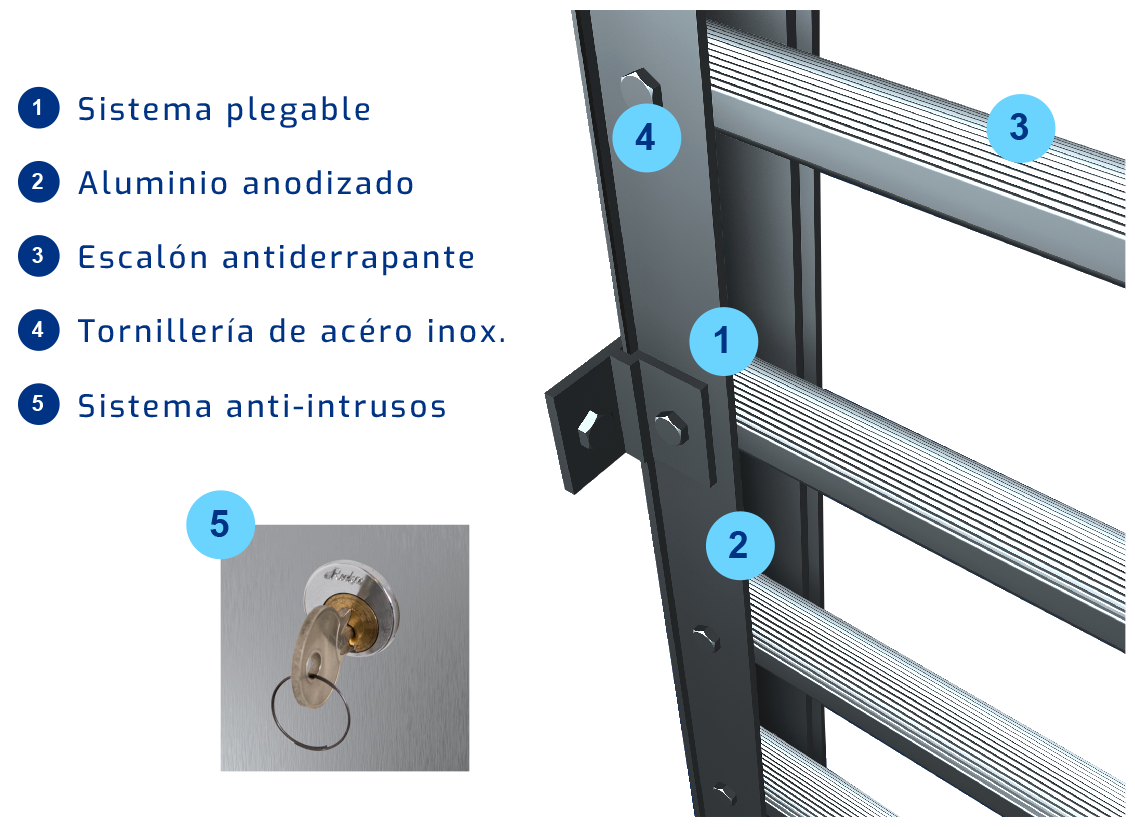 La escalera plegable Vitrelum está fabricada en aluminio estructural anodizado, un material altamente resistente que le proporciona protección adicional contra las condiciones climáticas cercanas a la costa. Gracias a este acabado, la escalera mantiene su durabilidad y apariencia en ambientes con alta humedad y exposición a la salinidad, ofreciendo una solución confiable y duradera para uso en interiores y exteriores.